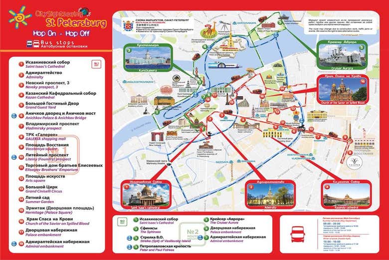 El autobús turístico cuenta con 2 rutas en las que se realizan 25 paradas en los principales lugares turísticos de San Petersburgo . Durante todo el trayecto a bordo del autobús descapotable de 2 plantas disfrutaréis de comentarios grabados en español sobre la historia de la ciudad y los lugares que se recorren.